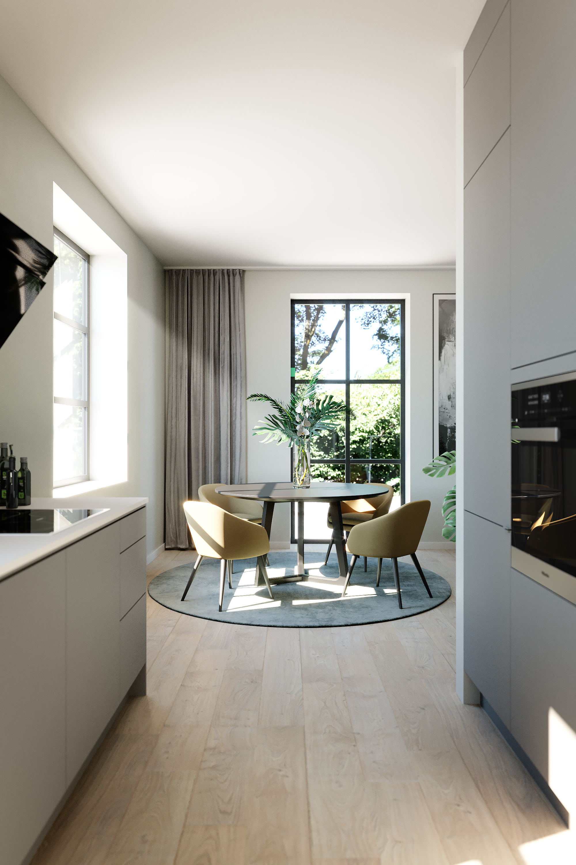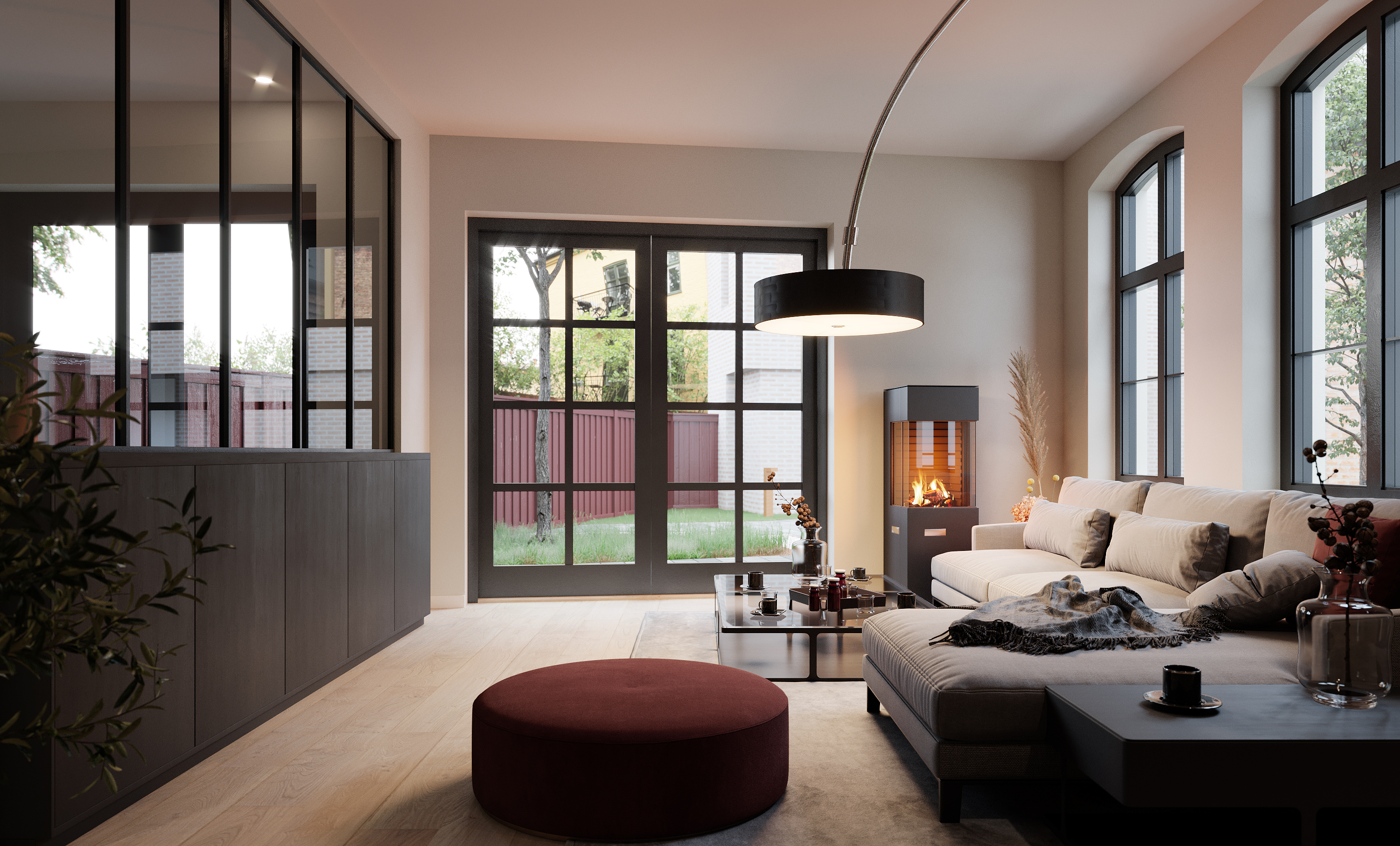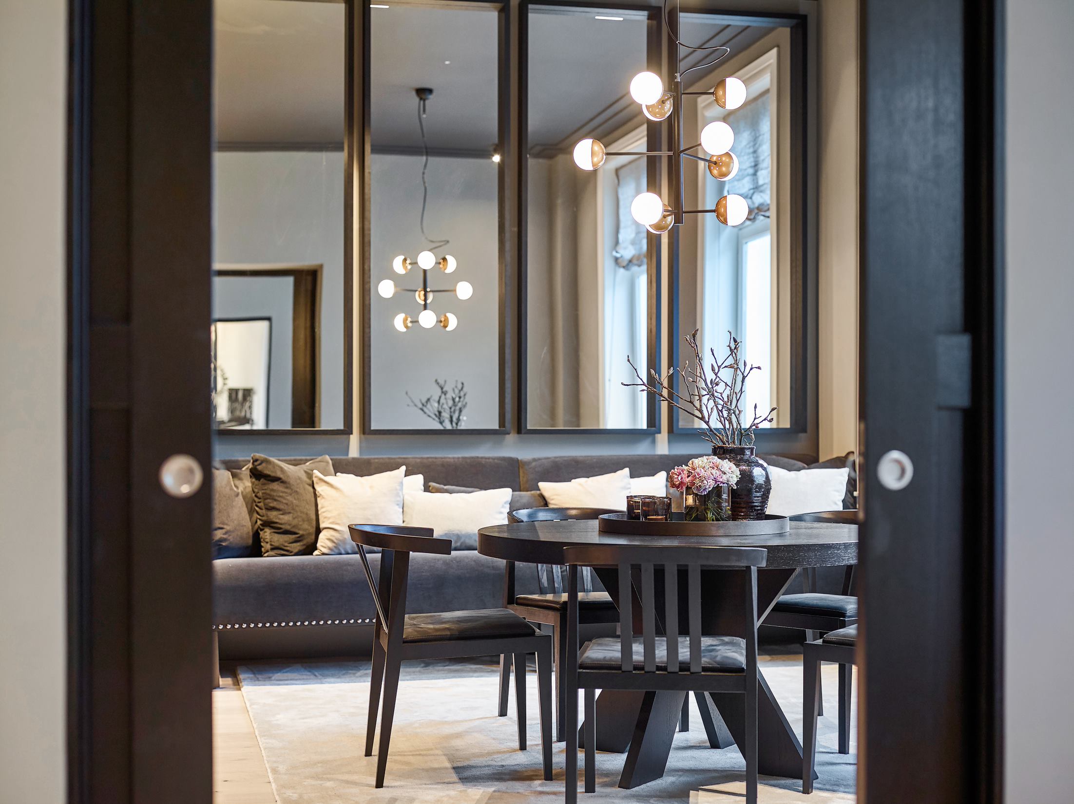 Skyvedører med glassvinduer gjør det mulig for lys å strømme gjennom hele rommet, samtidig som det skaper separasjon. Og enda bedre; de glir rett inn i veggen når de ikke brukes, og tar mye mindre plass enn å svinge dører.